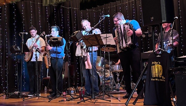 BELOW AND RIGHT: The Garrett Tatano Band at Slovene Party Center on October 6, 2024. Garrett Tatano: Accordion, Anthony Popovski: Banjo, Vince Filippelli: Sax, Terry Skovenski: Bass, Phil Yan III: Drums. In the picture below, Danny Klanica joins the band on accordion and even though he is blocked, RJ Zolka is on drums.